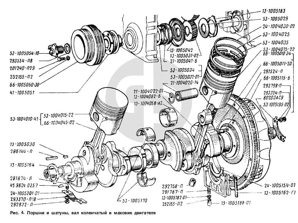 Поршни и шатуны, вал коленчатый и маховик двигателя ГАЗ-66