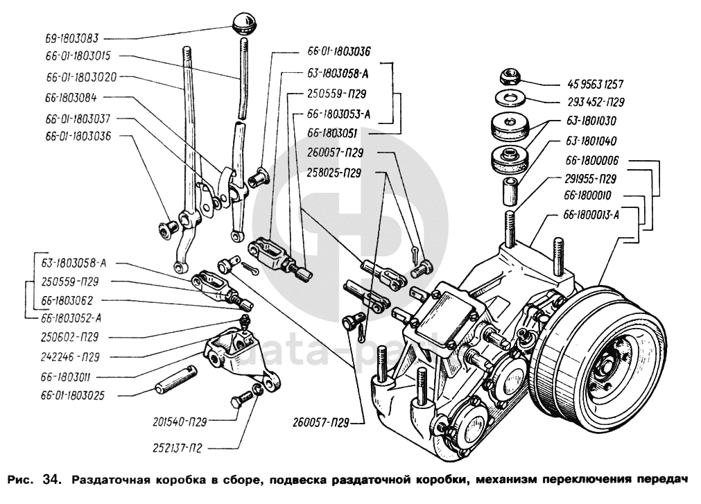 Раздаточная коробка в сборе, подвеска раздаточной коробки, механизм переключения передач ГАЗ-66