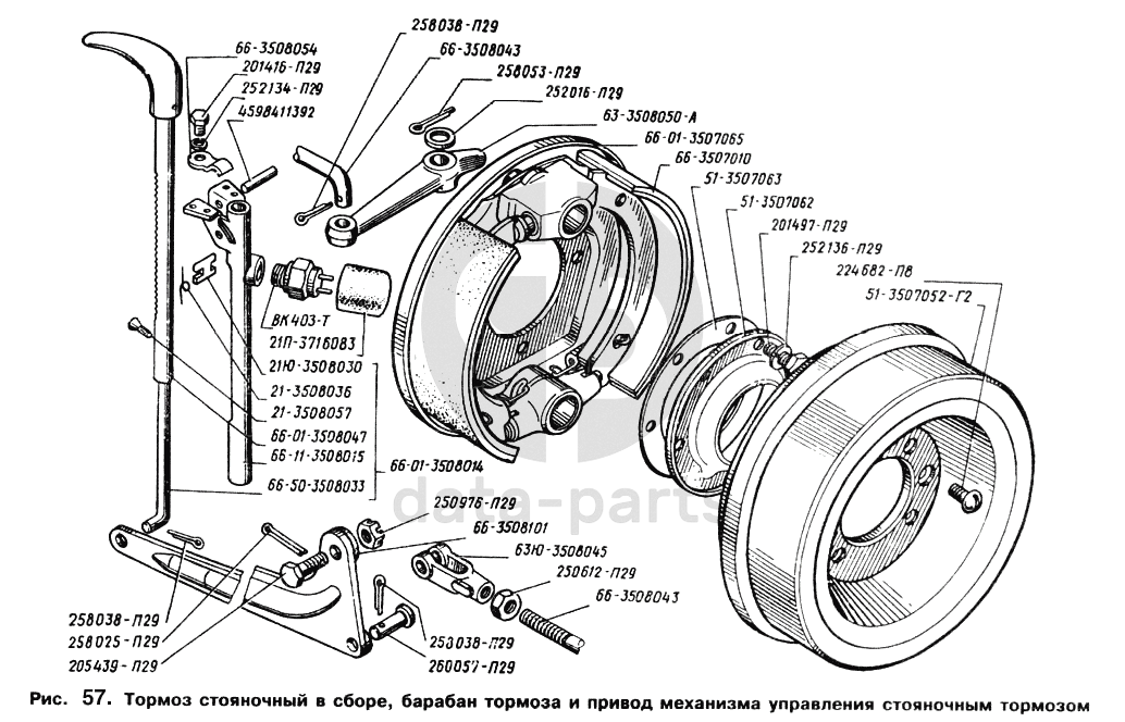 Тормоз стояночный в сборе, барабан тормоза и привод механизма управления стояночным тормозом ГАЗ-66
