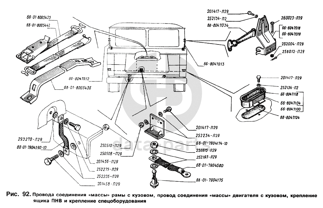 Провода соединения "массы" рамы с кузовом, провод соединения "массы" двигателя с кузовом, крепление ящика ПНВ и крепление спецоборудования ГАЗ-66
