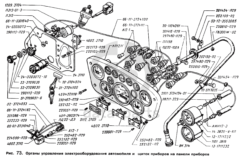 Щиток приборов на панели приборов, органы управления электрооборудования автомобиля ГАЗ-66