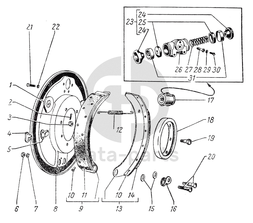 Детали для колесного цилиндра заднего тормоза (комплект состоит из деталей 51-3502051 и 51-3502058)