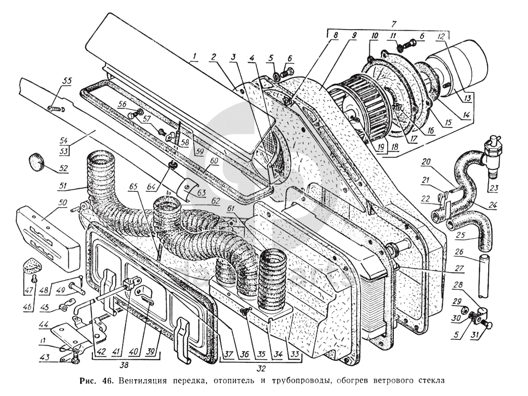 Вентиляция передка, отопитель и трубопроводы, обогрев ветрового стекла ГАЗ-52-02