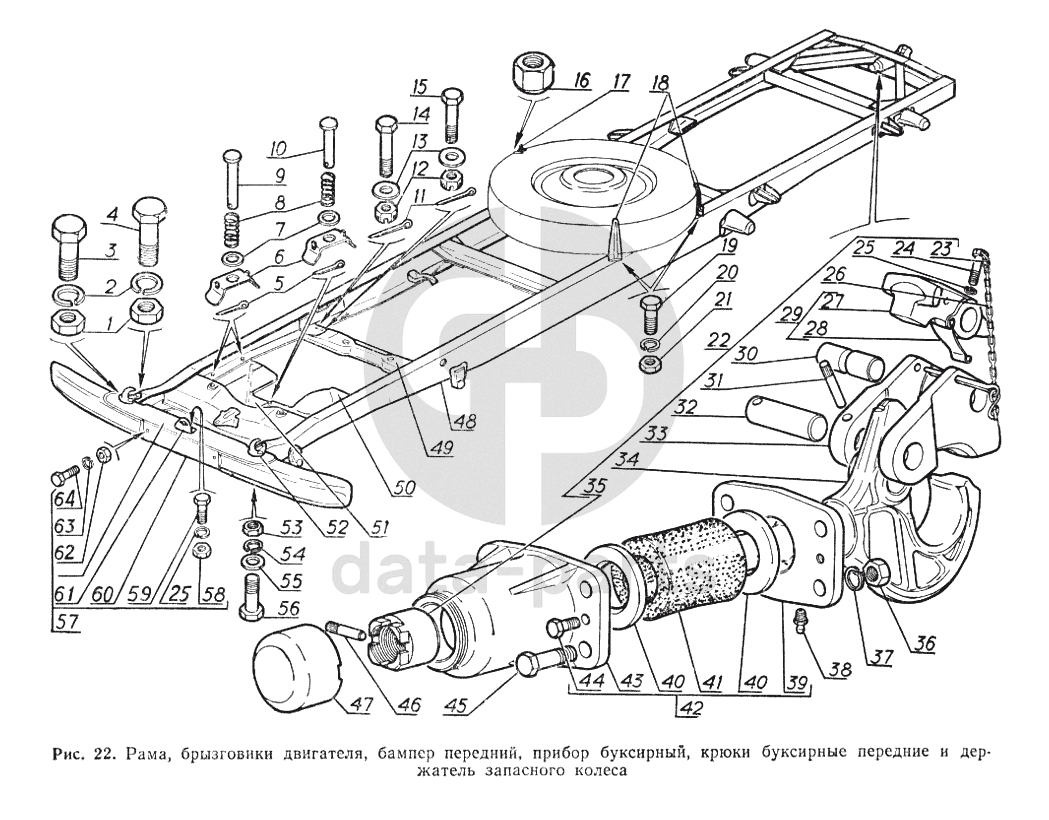 Рама, брызговики двигателя, бампер передний, прибор буксирный, крюки буксирные передние и держатель запасного колеса ГАЗ-52-02