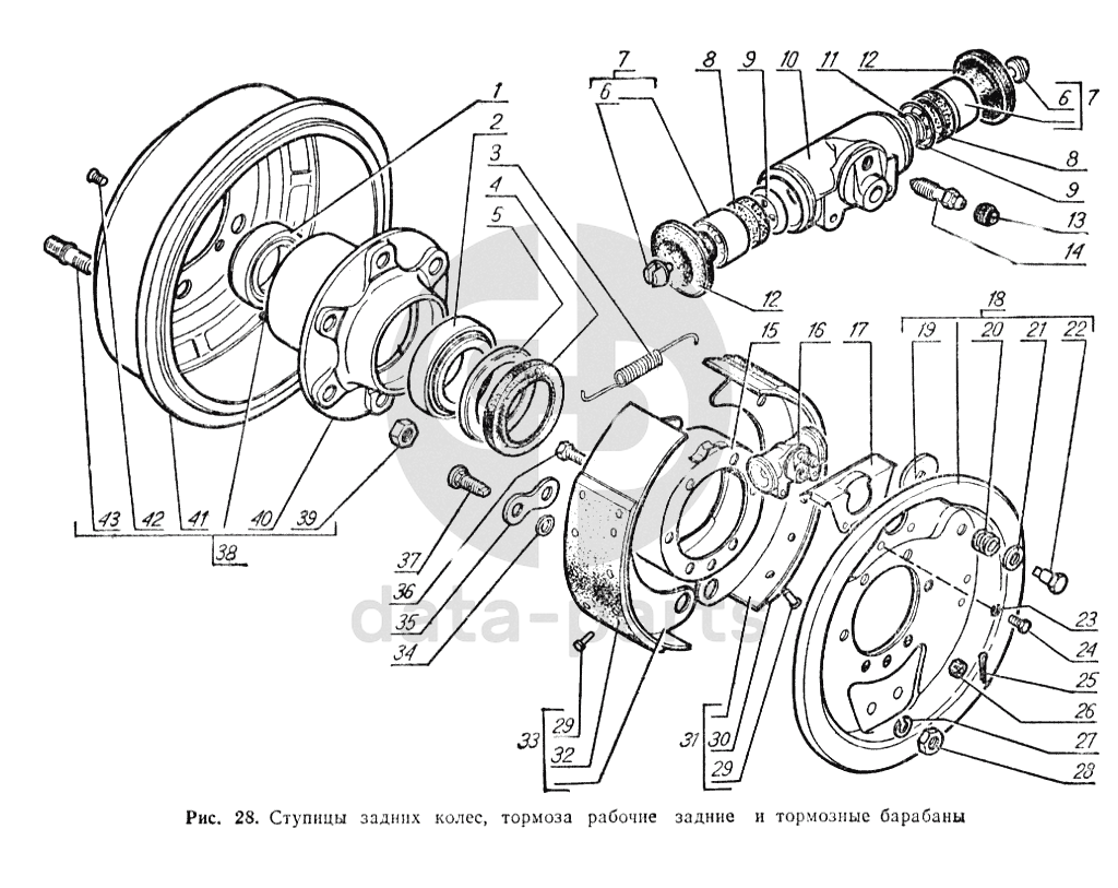Ступицы задних колес, тормоза рабочие задние и тормозные барабаны ГАЗ-52-02