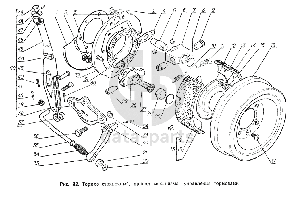 Тормоз стояночный, привод механизма управления тормозами ГАЗ-52-02