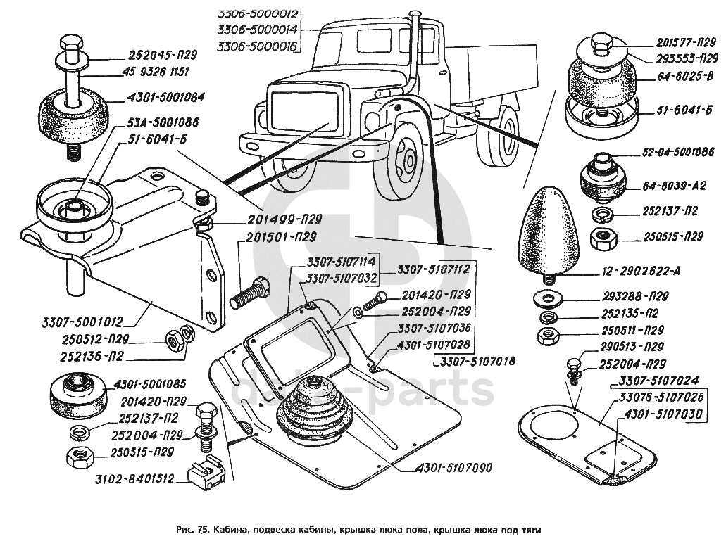 Кабина, подвеска кабины, крышка люка пола, крышка люка под тяги ГАЗ-3306