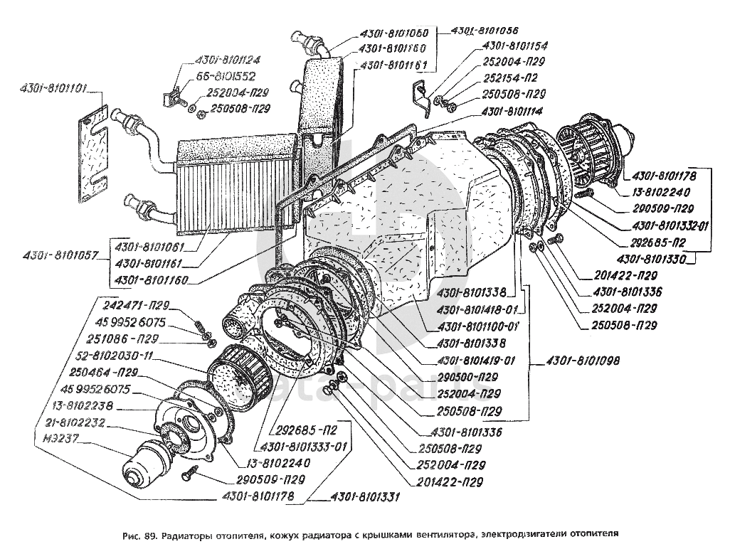 Радиаторы отопителя, кожух радиатора с крышками вентилятора, электродвигатели отопителя ГАЗ-3306