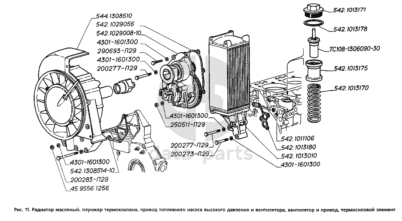 Радиатор масляный, плунжер термоклапана, привод топливного насоса высокого давления и вентилятора, вентилятор и привод, термосиловой элемент ГАЗ-3306
