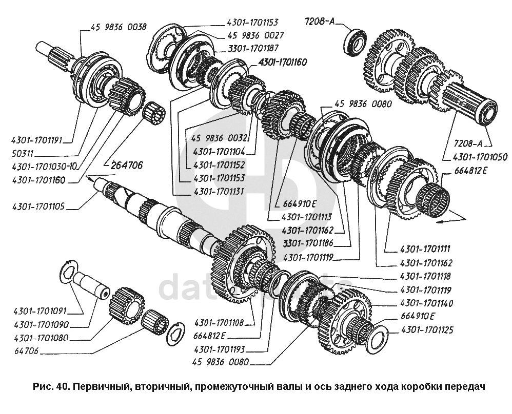 Первичный, вторичный, промежуточный валы и ось заднего хода коробки передач ГАЗ-3306