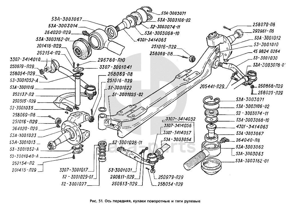 Ось передняя, кулаки поворотные и тяги рулевые ГАЗ-3306