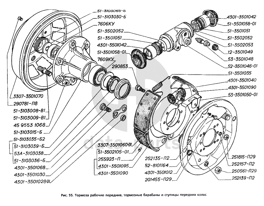 Тормоза рабочие передние, тормозные барабаны и ступицы передних колес ГАЗ-3306