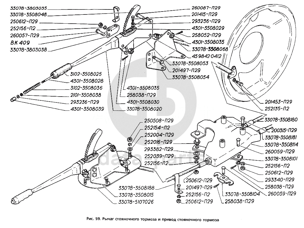 Рычаг стояночного тормоза и привод стояночного тормоза ГАЗ-3306