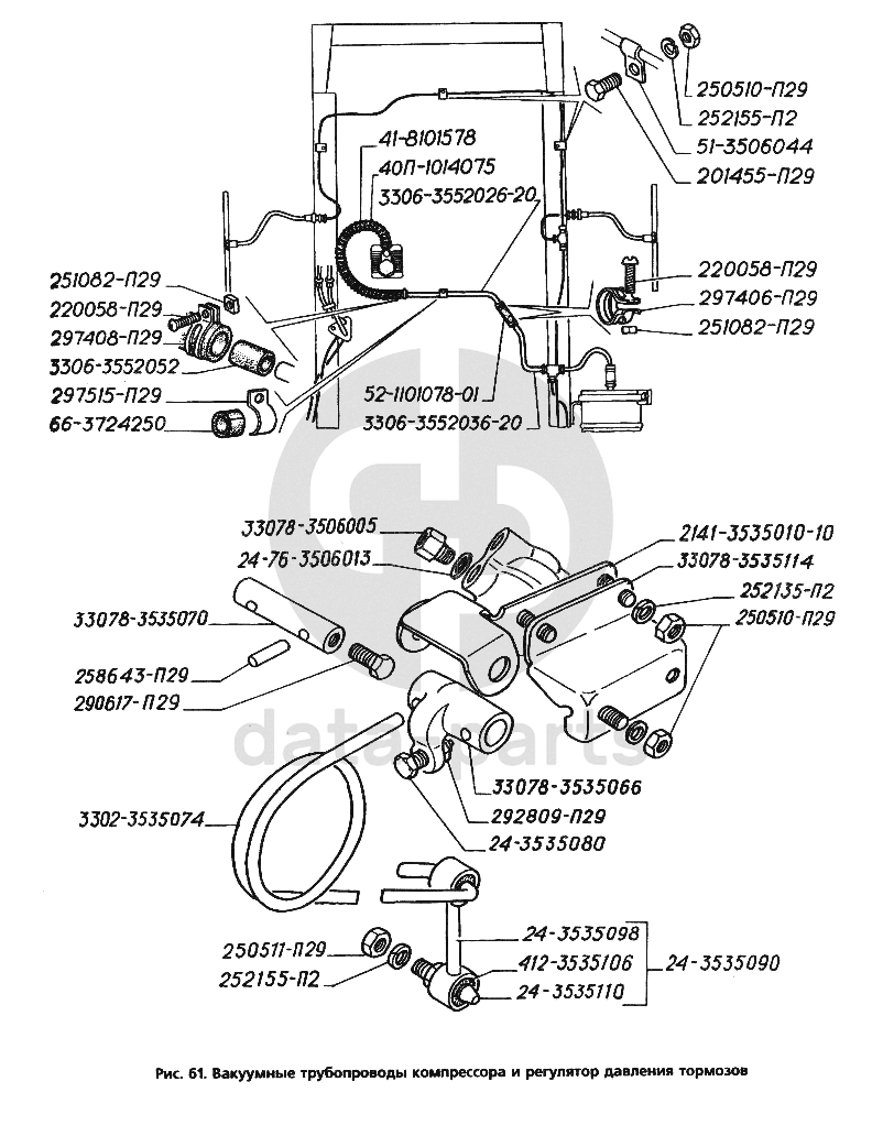 Вакуумные трубопроводы компрессора и регулятор давления тормозов ГАЗ-3306