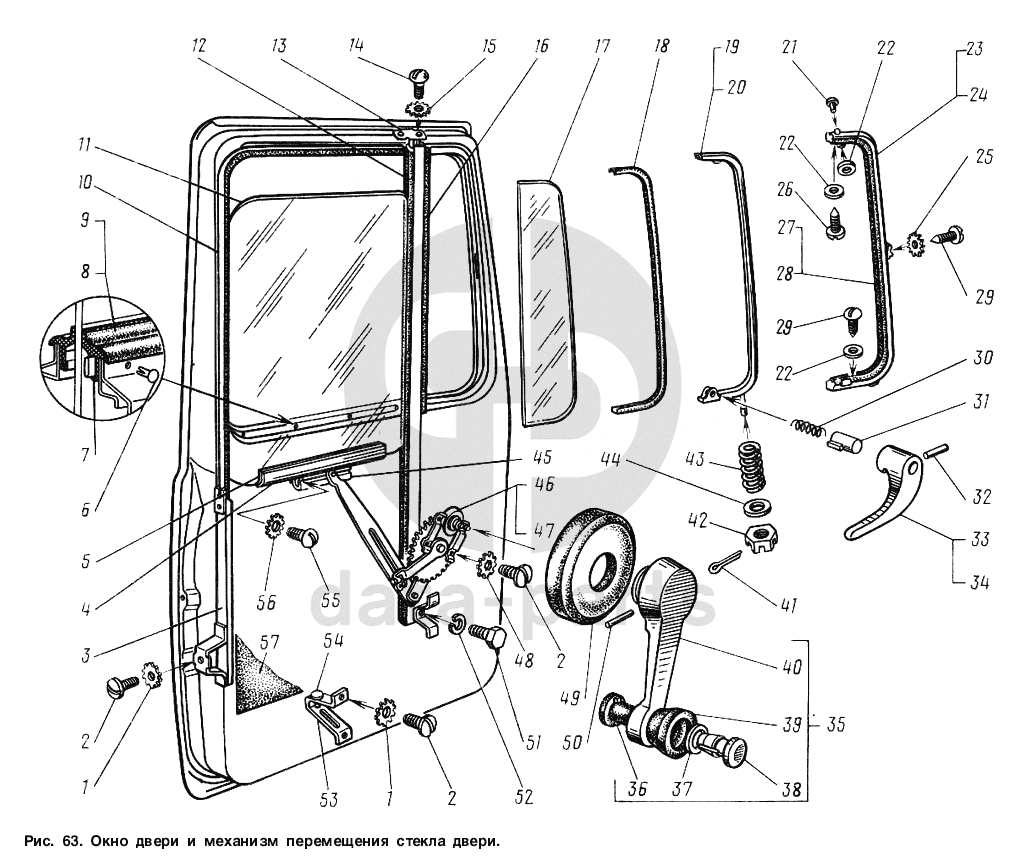 Окно двери и механизм перемещения стекла двери ГАЗ-3307