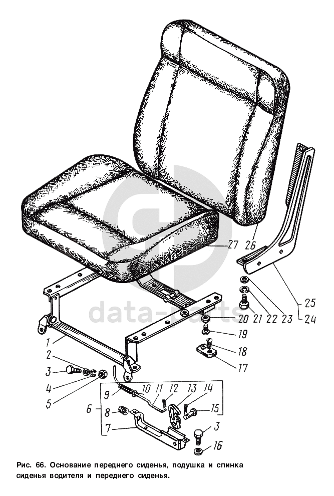 Основание переднего сиденья, подушка и спинка сиденья водителя и переднего сиденья ГАЗ-3307