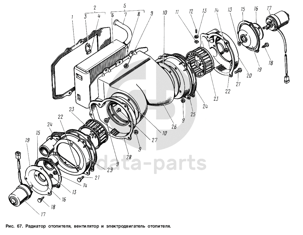 Радиатор отопителя, вентилятор и электродвигатель отопителя ГАЗ-3307