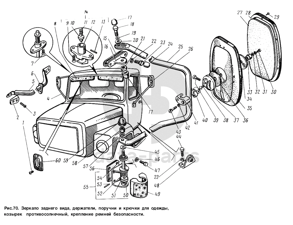 Зеркало заднего вида, держатели, поручни и крючки для одежды, козырек противосолнечный, крепление ремней безопасности ГАЗ-3307