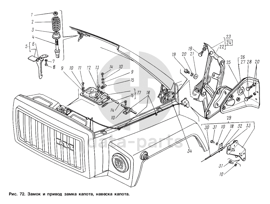 Замок и привод замка капота, навеска капота ГАЗ-3307