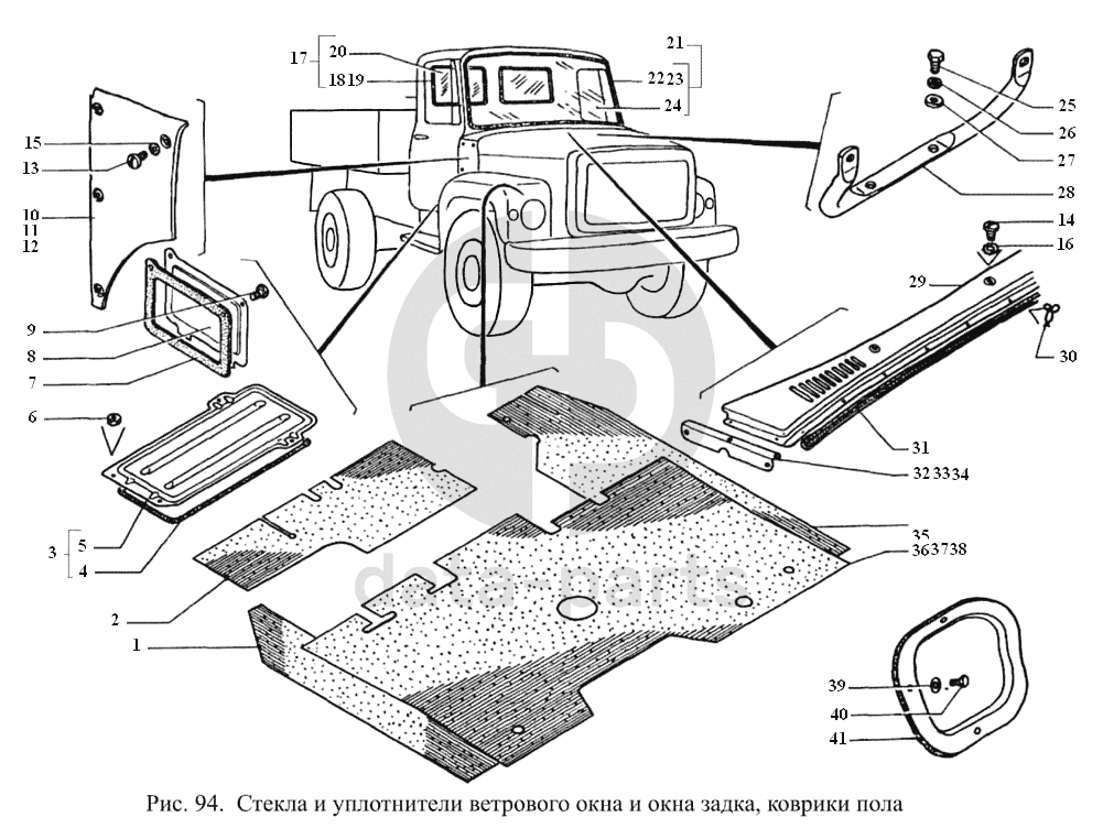 Стекла и уплотнители ветрового окна и окна задка, коврики пола ГАЗ-3308