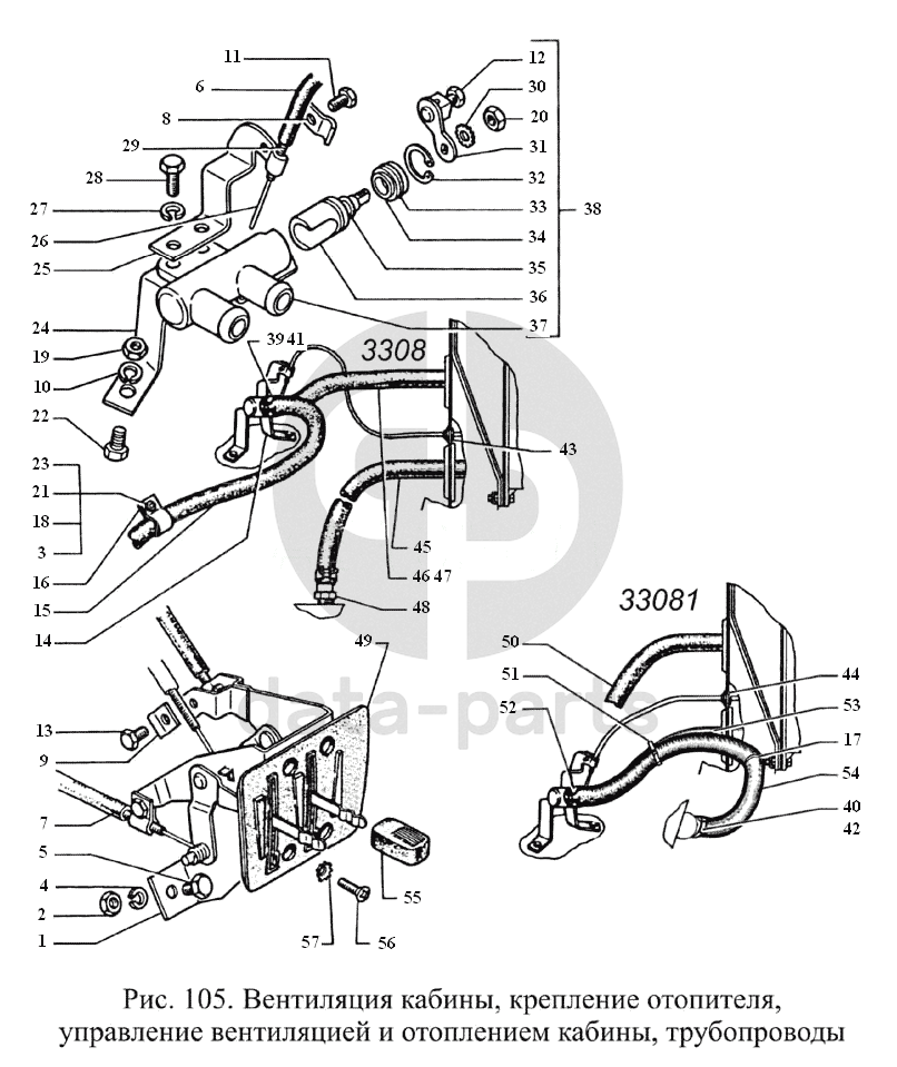 Вентиляция кабины, крепление отопителя, управление вентиляцией и отоплением кабины, трубопроводы ГАЗ-3308