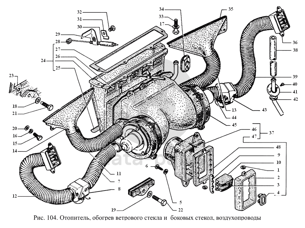 Отопитель, обогрев ветрового стекла и боковых стекол, воздухопроводы ГАЗ-3308