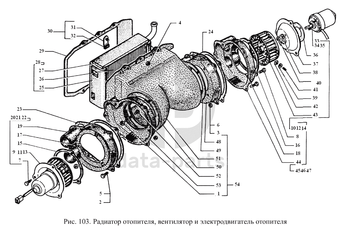 Радиатор отопителя, вентилятор и электродвигатель отопителя ГАЗ-3308