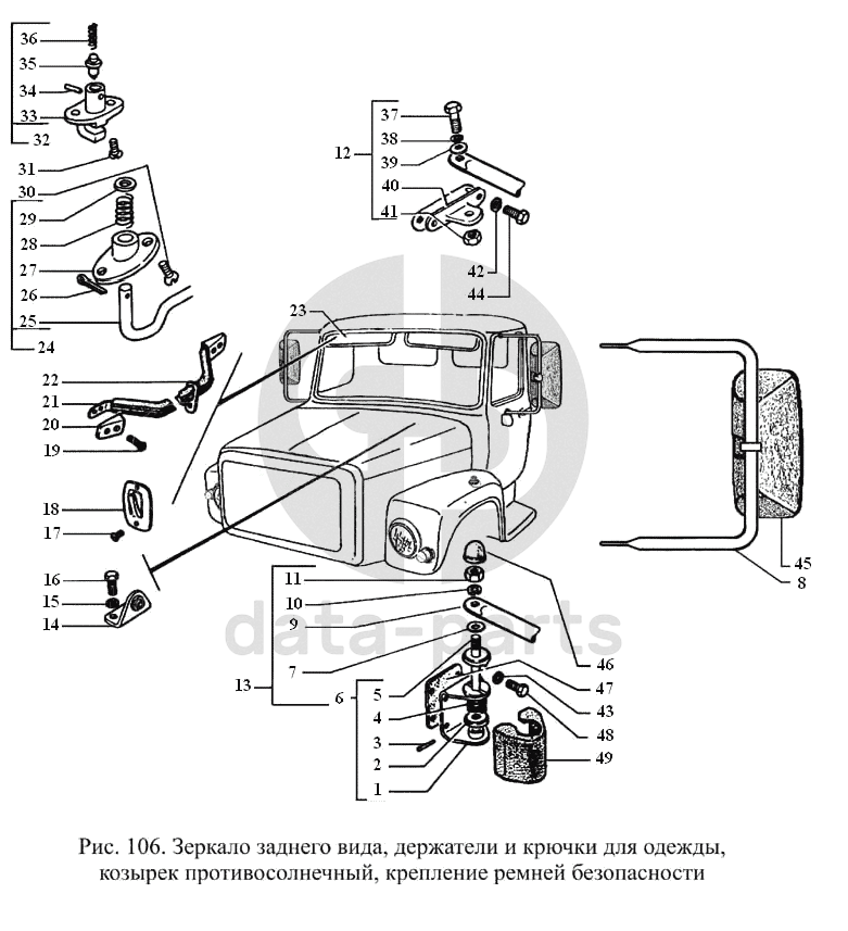 Зеркало заднего вида, держатели и крючки для одежды, козырек противосолнечный, крепление ремней безопасности ГАЗ-3308