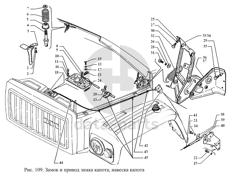 Замок и привод замка капота, навеска капота ГАЗ-3308