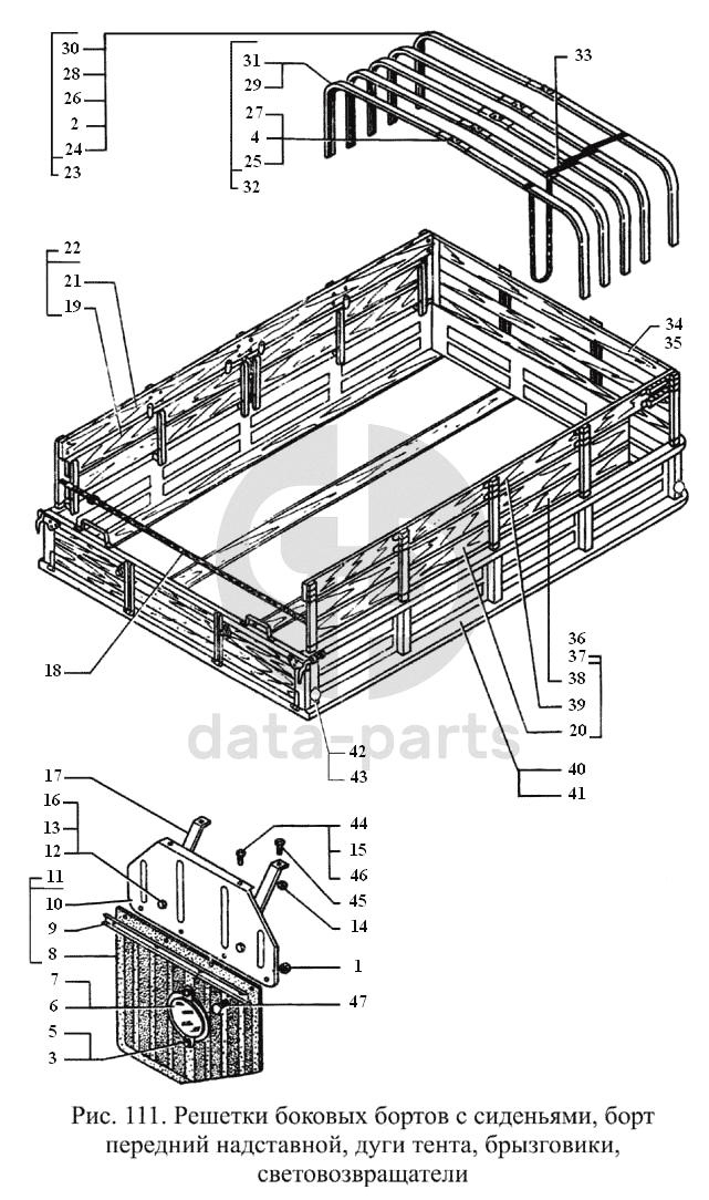 Решетки боковых бортов с сиденьями, борт передний надставной, дуги тента, брызговики, световозвращатели ГАЗ-3308