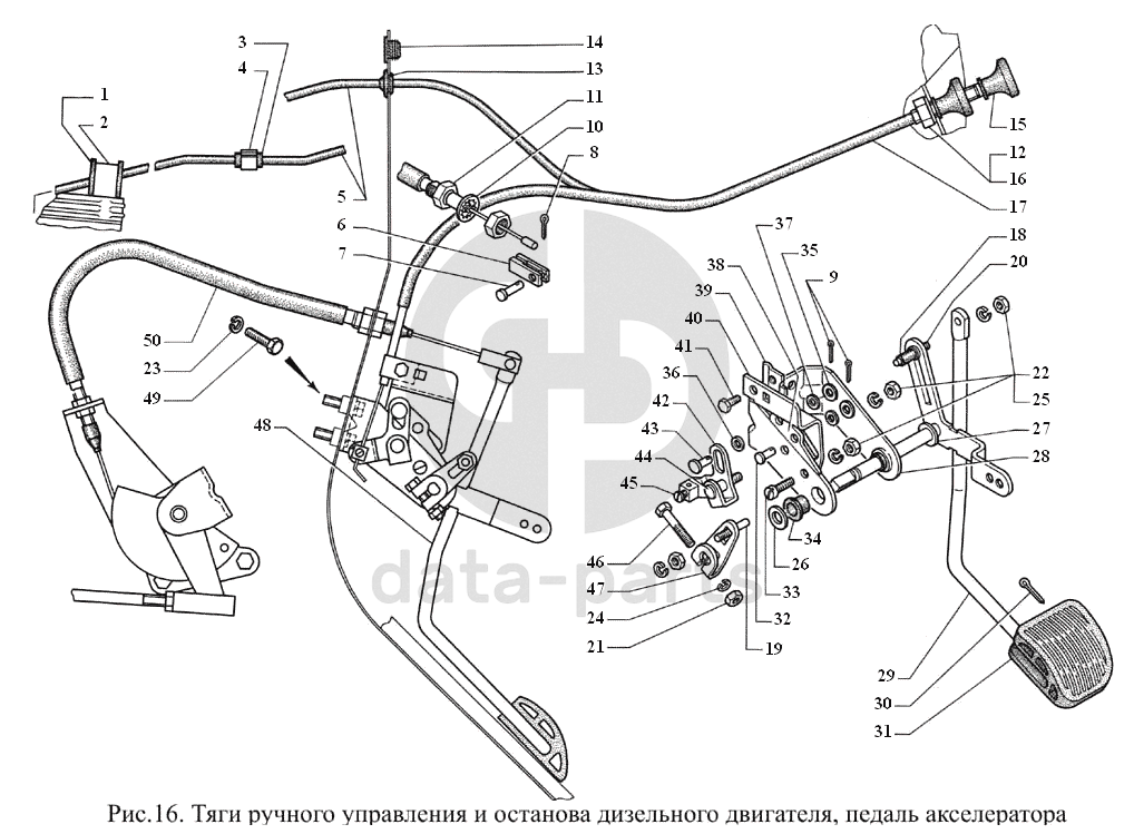 Тяги ручного управления и останова дизельного двигателя, педаль акселератора ГАЗ-3308