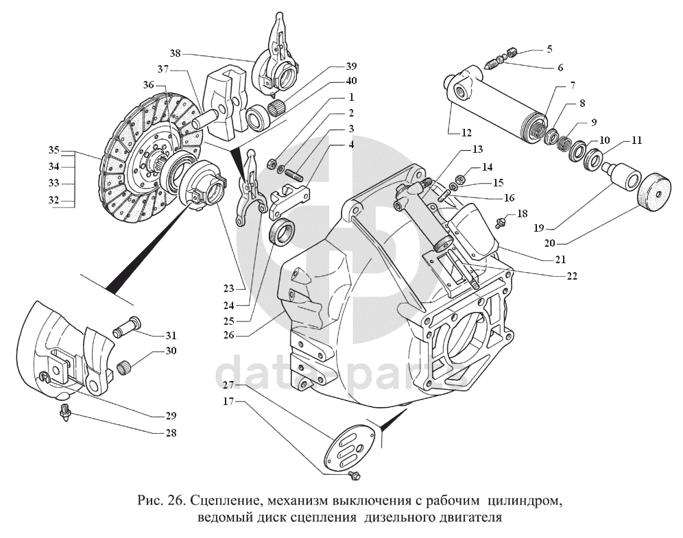 Сцепление, механизм выключения с рабочим цилиндром, ведомый диск сцепления дизельного двигателя ГАЗ-3308
