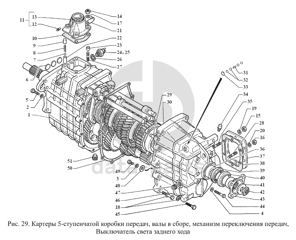 Картеры 5-ступенчатой коробки передач, валы в сборе, механизм переключения передач, выключатель света заднего хода ГАЗ-3308