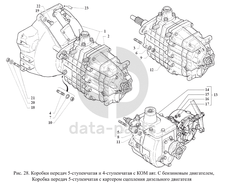 Коробка передач 5-ступенчатая и 4-ступенчатая с коробкой отбора мощности авт. с бензиновым двигателем, коробка передач 5-ступенчатая с картером сцепления дизельного двигателя ГАЗ-3308
