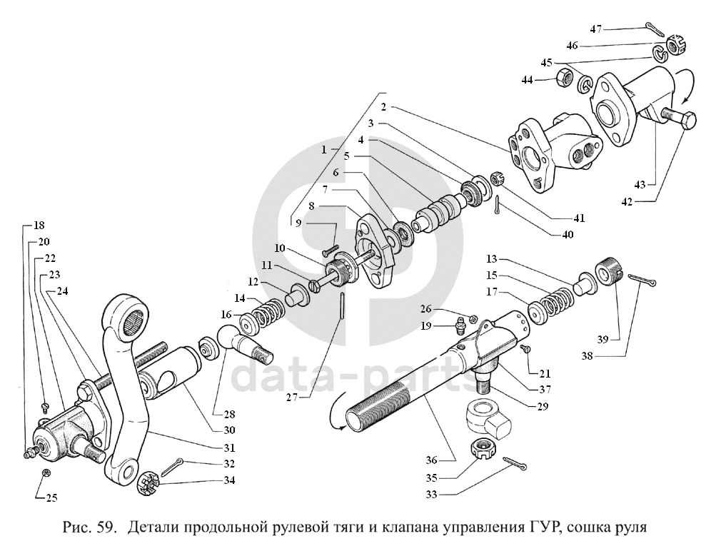Детали продольной рулевой тяги и клапана управления ГУР, сошка руля ГАЗ-3308