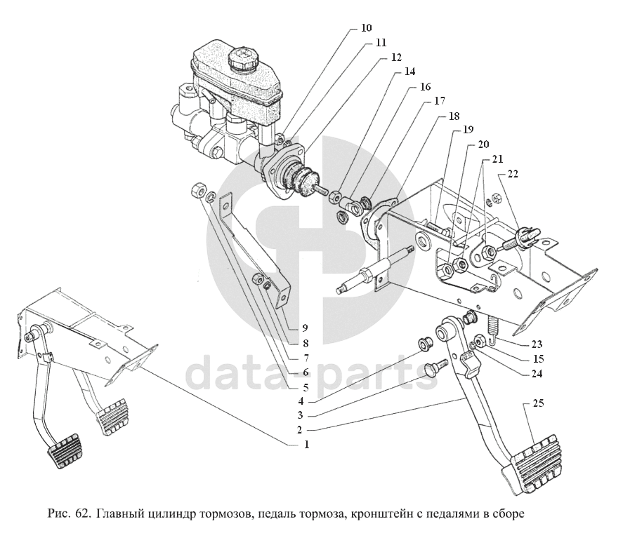 Главный цилиндр тормозов, педаль тормоза, кронштейн с педалями в сборе ГАЗ-3308