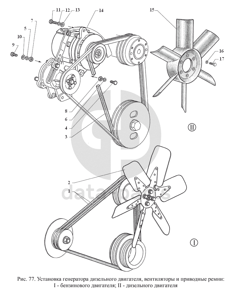 Установка генератора дизельного двигателя, вентиляторы и приводные ремни: I – бензинового двигателя, II – дизельного двигателя ГАЗ-3308