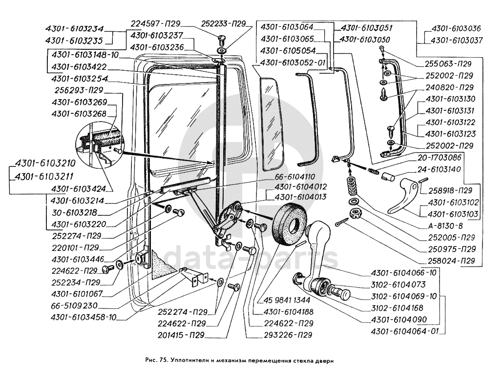 Уплотнители и механизм перемещения стекла двери ГАЗ-3309