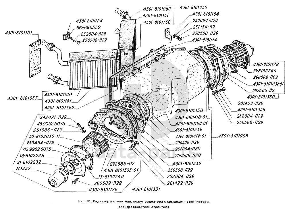Радиаторы отопителя, кожух радиатора с крышками вентилятора, электродвигатели отопителя ГАЗ-3309