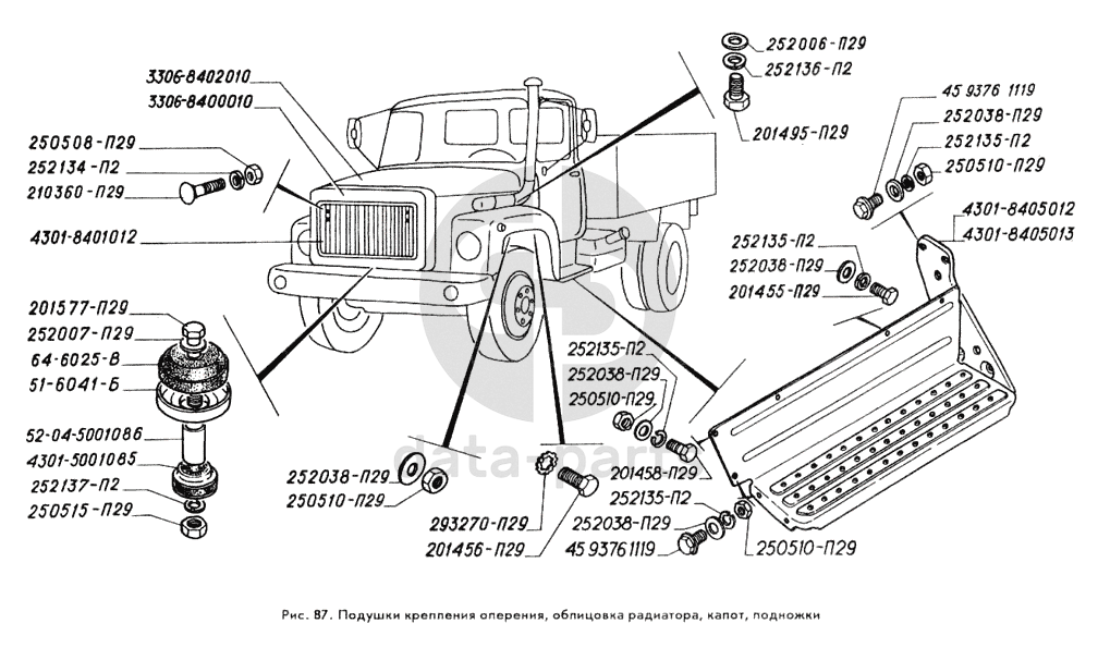 Подушки крепления оперения, облицовка радиатора, капот, подножки ГАЗ-3309