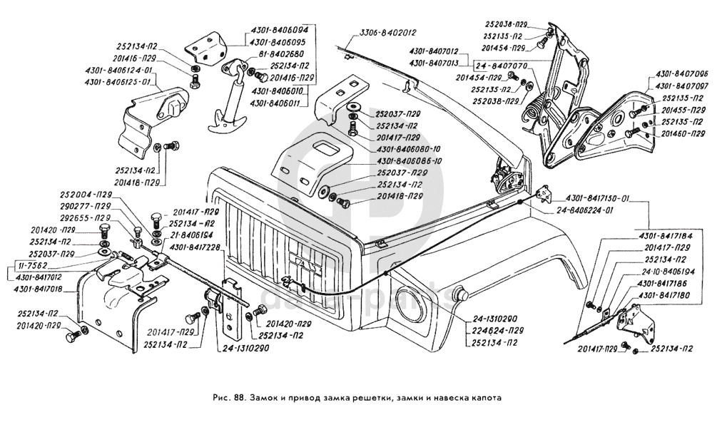 Замок и привод замка решетки, замки и навеска капота ГАЗ-3309