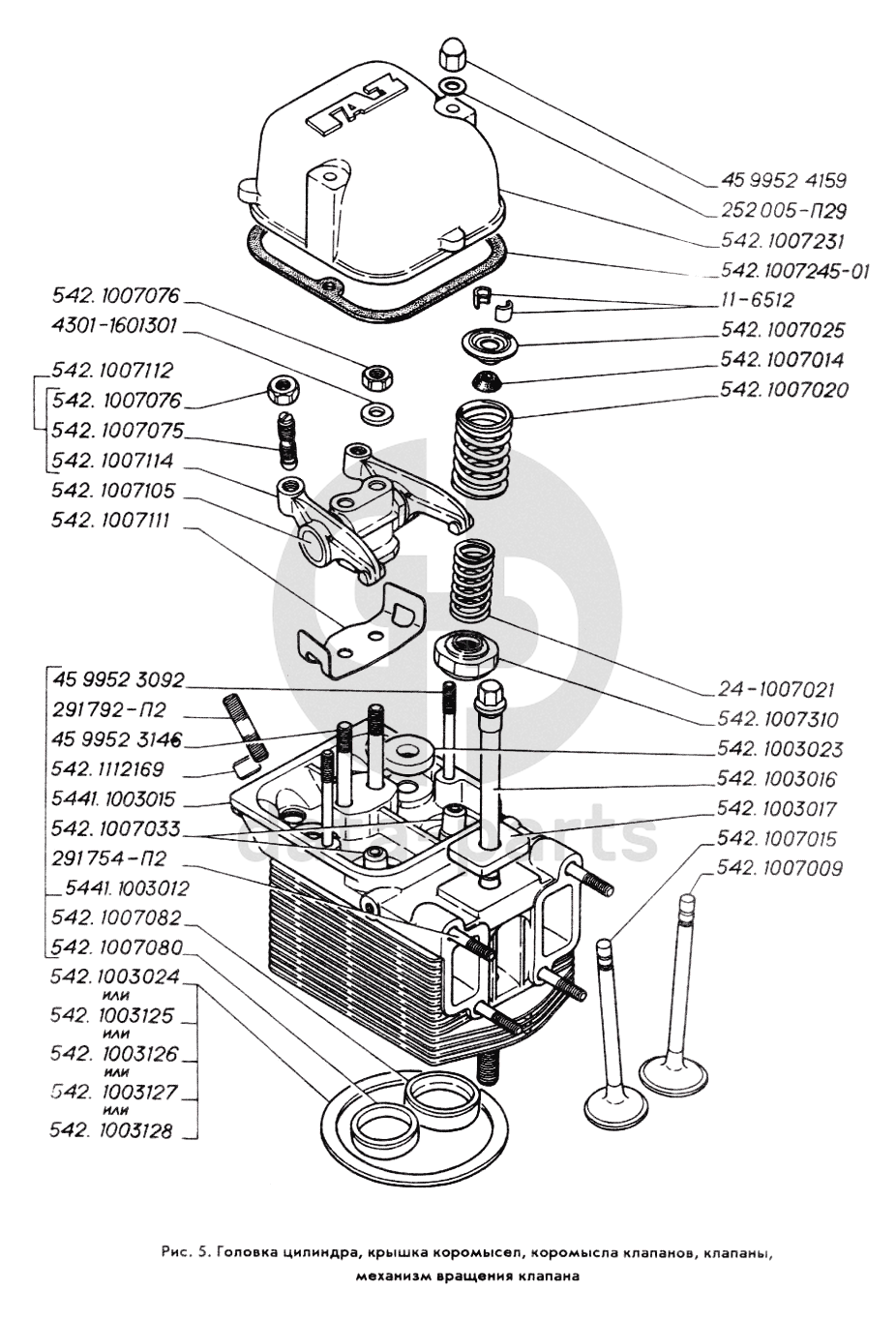 Головка цилиндра, крышка коромысел, коромысла клапанов, клапаны, механизм вращения клапана ГАЗ-3309