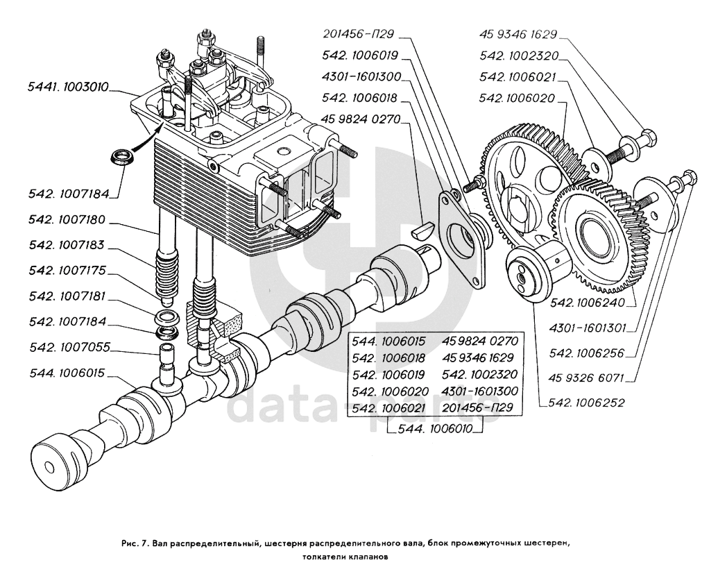 Вал распределительный, шестерня распределительного вала, блок промежуточных шестерен, толкатели клапанов ГАЗ-3309