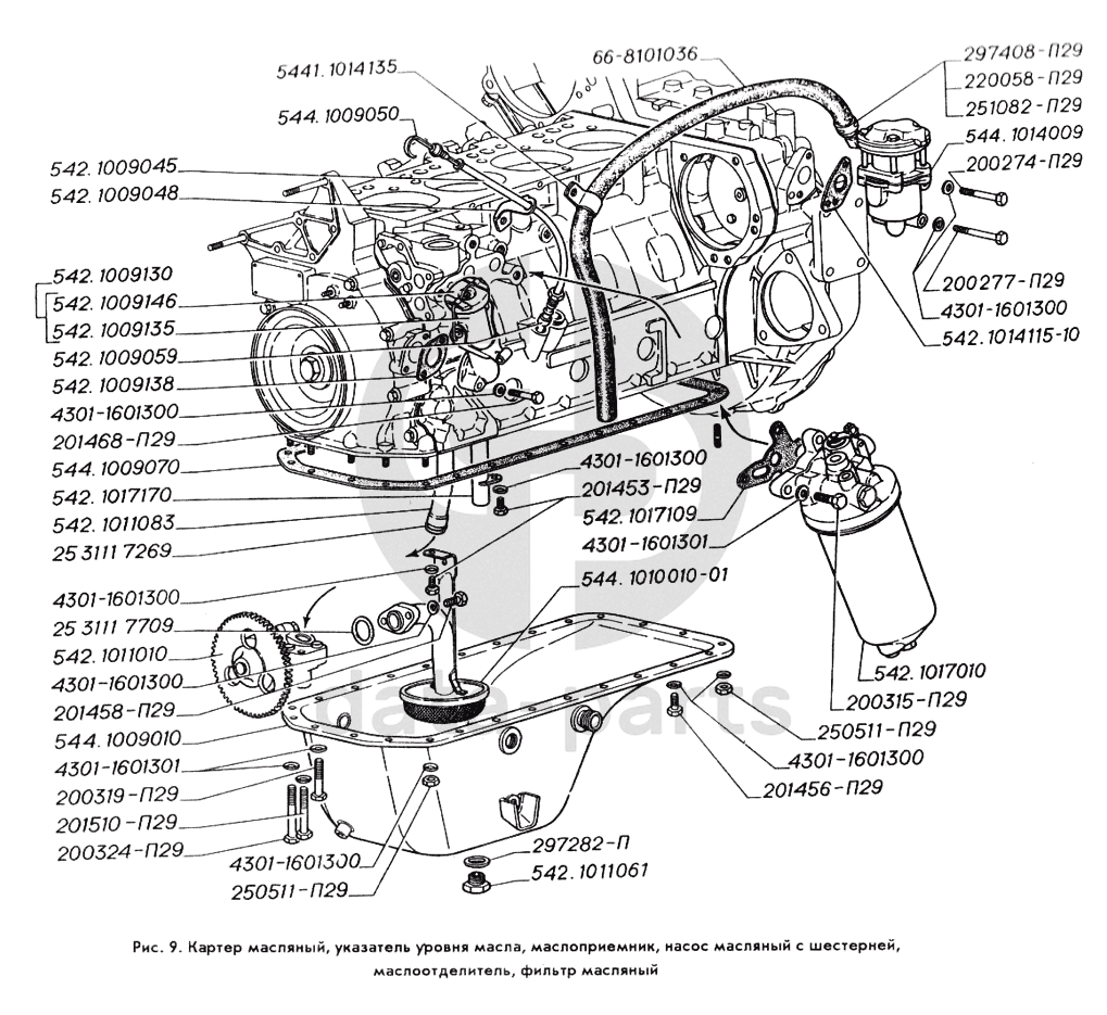 Картер масляный, указатель уровня масла, маслоприемник, насос масляный с шестерней, маслоотделитель, фильтр масляный ГАЗ-3309
