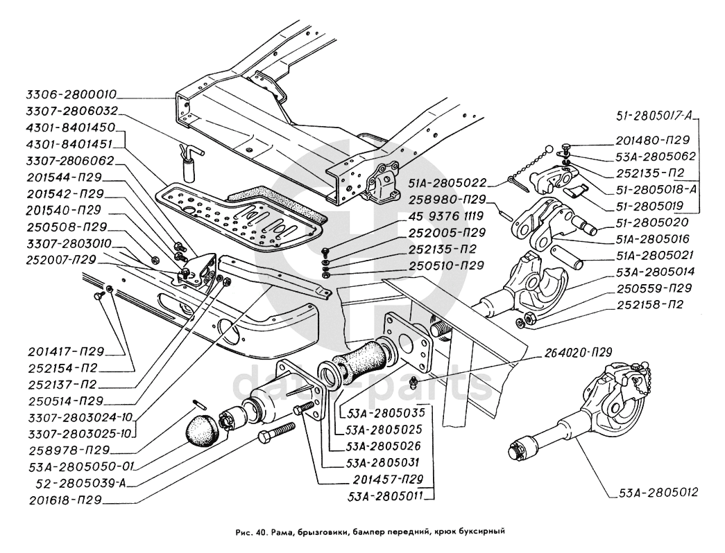 Рама, брызговики, бампер передний, крюк буксирный ГАЗ-3309
