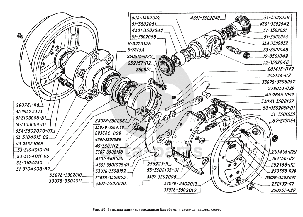 Тормоза задние, тормозные барабаны и ступицы задних колес ГАЗ-3309