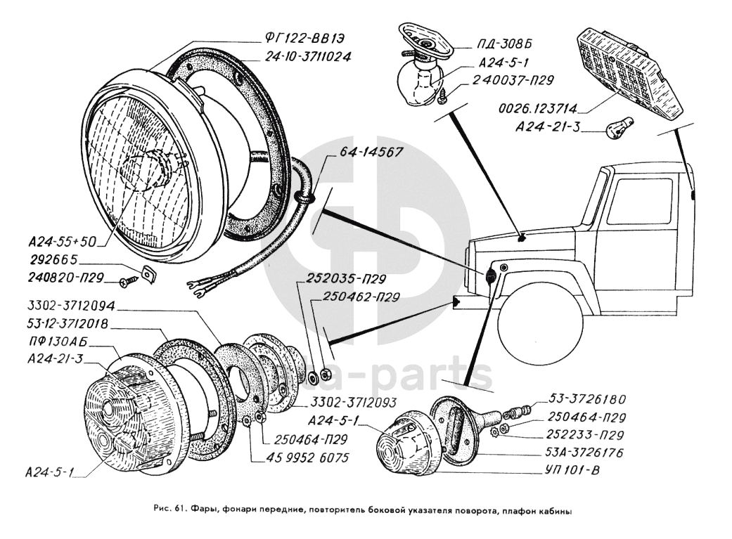 Фары, фонари передние, повторитель боковой указателя поворота, плафон кабины ГАЗ-3309