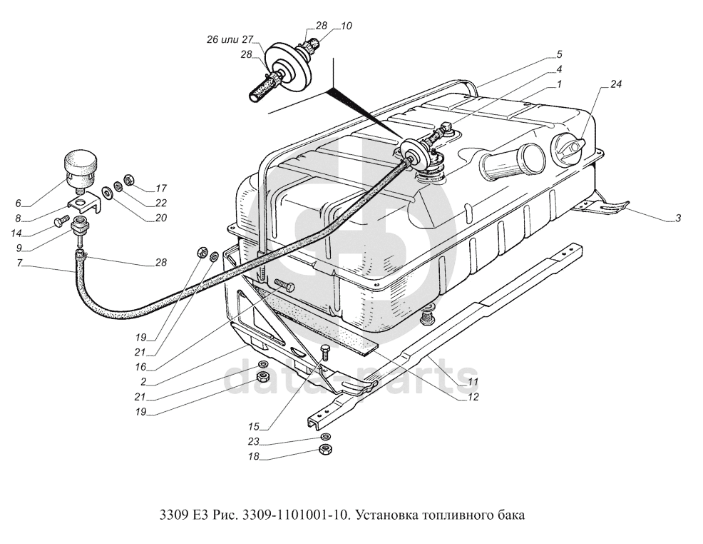 3309-1101001-10. Установка топливного бака ГАЗ-3309 (доп. с дв. ЗМЗ Е 3)