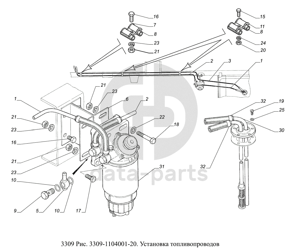 3309-1104001-20. Установка топливопроводов ГАЗ-3309 (доп. с дв. ЗМЗ Е 3)