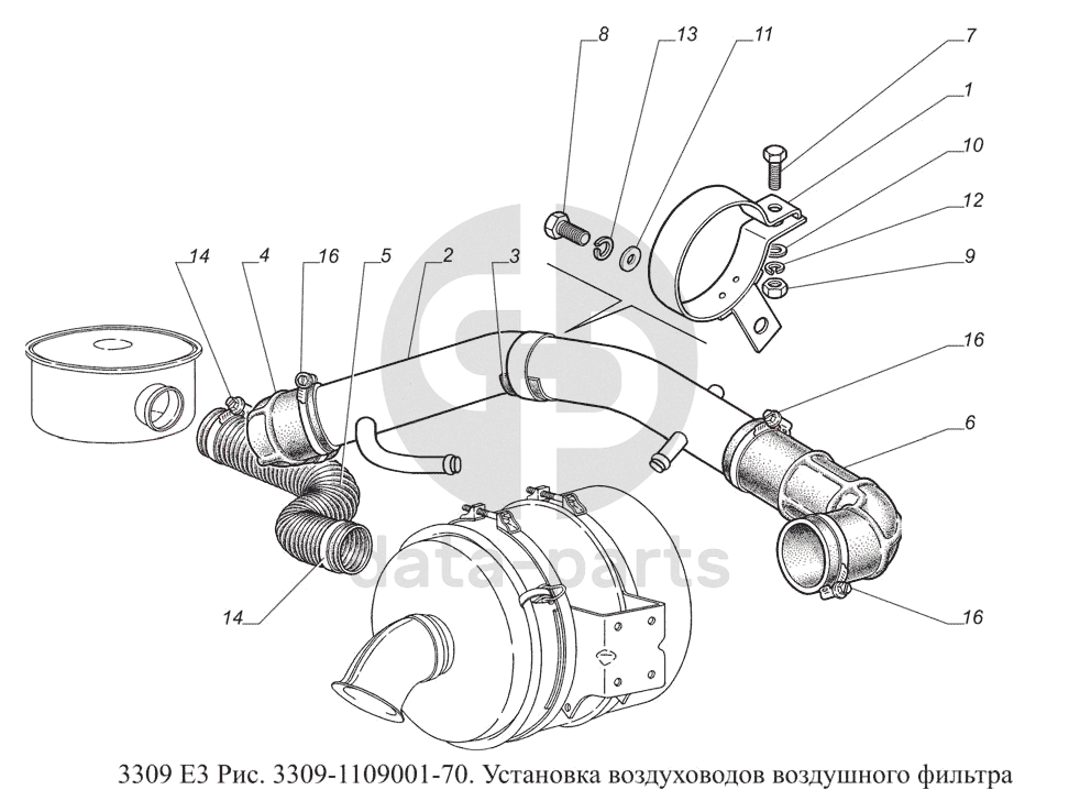 3309-1109001-70. Установка воздуховодов воздушного фильтра ГАЗ-3309 (доп. с дв. ЗМЗ Е 3)